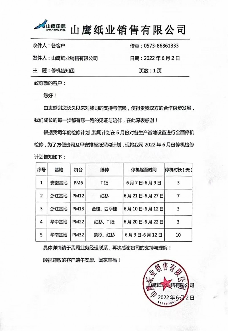 6月7日,玖龍部分基地結(jié)束了為期6天的價格優(yōu)惠并恢復(fù)原價,個別基地高端牛卡上調(diào)100元/噸。在此期間山鷹也發(fā)布了6月份的停機檢修告知函,宣布安徽、浙江、湖北及福建4大基地的5臺紙機停機3-10天!合計減少產(chǎn)量約2.2萬噸。