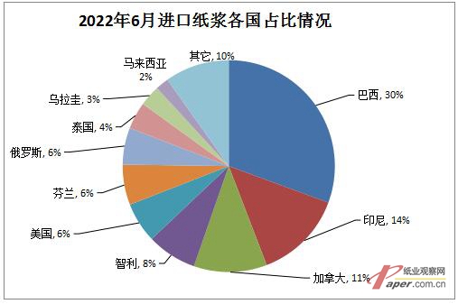 根據紙業觀察網統計,6月我國紙漿主要進口來源國分別為巴西、印尼、加拿大、智利、美國、芬蘭、俄羅斯、泰國、烏拉圭、馬來西亞等。其中,巴西牢牢位居首位,為71.93萬噸,占比達到了30.77%;其次為印尼,為31.99萬噸,占比13.68%;再次為加拿大,為26.20萬噸,占比11.11%。