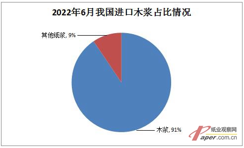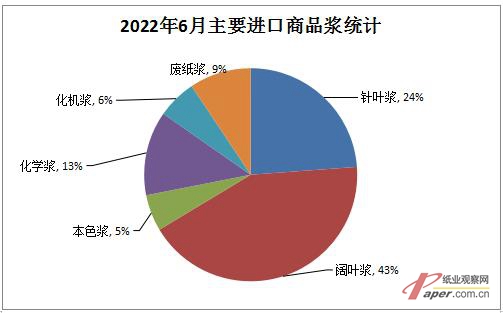 從細分市場來看,6月針葉漿進口量為56.16萬噸,占紙漿總量的23.83%,進口量同比下降23.26%,進口額為52599.79萬美元,同比下降18.21%;闊葉漿進口量為99.86萬噸,占紙漿總量的42.55%,同比增長0.19%,進口額為67071.04萬美元,同比增長2.75%;本色漿進口量為13.18萬噸,占紙漿總量的5.53%,同比增長48.70%,進口額為10802.53萬美元同比增長66.59%;化學漿進口量為30.03萬噸,占紙漿總量的12.77%,同比增長4.22%,進口額為30517.63萬美元,同比增長1.12%;化機漿進口量為13.72萬噸,占紙漿總量的5.96%,同比下降5.66%,進口額為7872.77萬美元,同比下降0.15%;廢紙漿進口量為21.80萬噸,占紙漿總量的9.36%,同比下降15.24%,進口額為10031.14萬美元,同比下降1.60%。