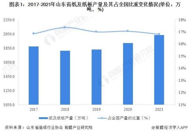 作為造紙大省,山東省造紙業在全國造紙行業的地位始終穩居全國前列,2017年以來,山東紙及紙板產量占比保持震蕩上行的走勢,到2021年,山東紙及紙板產量占全國紙及紙板產品總產量的16.8%。