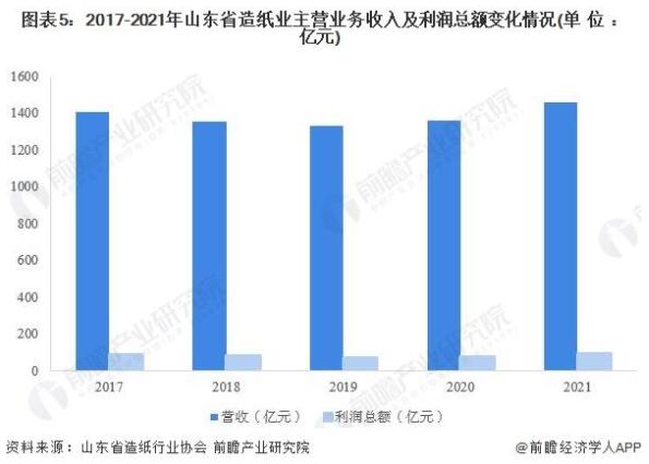 從行業經營效益來看,2017年以來,山東省造紙業主營收入呈現先降后升的趨勢,2021年,全省造紙業實現營收1455億元,同比增長6.98%,創近六年新高。