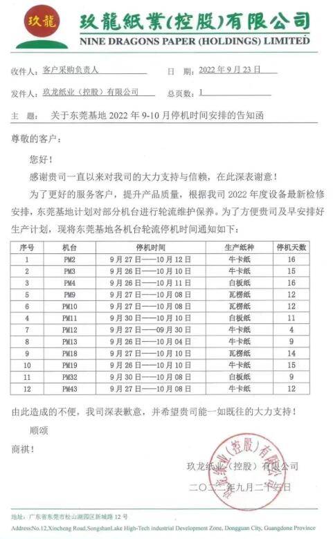 東莞玖龍12臺紙機輪流停產!玖龍多基地發布國慶后漲價計劃