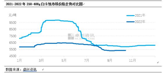 2022年第三季度供需矛盾激化,白卡紙市場下跌調整。四季度供應仍有增加預期,但傳統旺季需求向好,加之成本支撐下紙廠拉漲心態堅決,預計市場存窄幅上行可能。