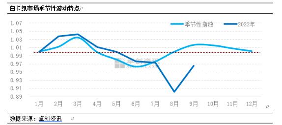 從白卡紙市場季節性波動特點來看,三季度處于淡季下滑與旺季來臨市場回漲的轉換期。可以從近十年季節性指數看出,7-8月份市場跌勢逐步收窄,9月份由跌轉漲。但是今年7-8月份市場跌勢逐步擴大,尤其是“金九”市場均價環比不漲反降,呈現出與歷史規律相悖的走勢。市場需求疲軟是白卡紙走勢低于預期的主要影響因素。