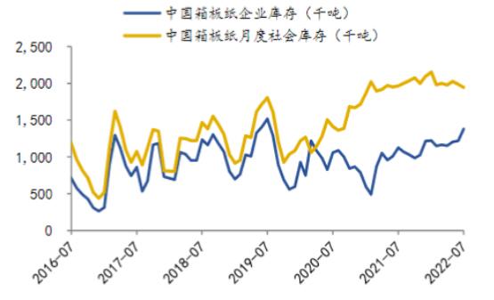 箱板紙下游家電產量環比下降。2022年7月份,四大家電產量累計4866.4萬臺,環比下降5.9%。家電產量的下降,導致包裝用的箱板紙需求也隨之下降,庫存被迫升高,紙企承擔較高的去庫存壓力。2022年7月底,箱板紙廠商和社會庫存分別為138.05萬噸和194.44萬噸,環比上漲13.27%和下降2.15%,同比分別上升22.83%和下降1.04%。