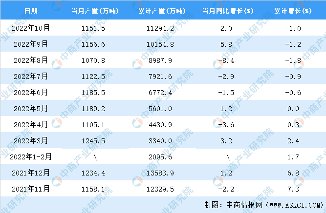 2022年10月全國機(jī)制紙及紙板產(chǎn)量為1151.5萬噸,同比增長2%。2022年1-10月全國機(jī)制紙及紙板產(chǎn)量為11294.2萬噸,同比下降1%。