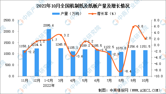 2022年10月全國機(jī)制紙及紙板增長情況: