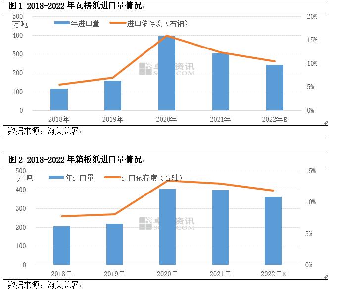 從長周期來看,2018-2022年中國瓦楞及箱板紙總進口量呈現(xiàn)先增后減趨勢,進口依存度也呈現(xiàn)先增后降的趨勢。其中變化最為明顯的是2020年,瓦楞紙與箱板紙進口量達到近五年高值800萬噸,進口依存度分別達到15.91%與13.42%。