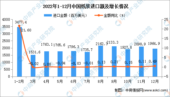 從金額方面來看,2022年12月中國紙漿進口金額1964.9百萬美元,同比增長0.49%;1-12月我國紙漿累計進口金額22349.4百萬美元,同比增長11.4%。