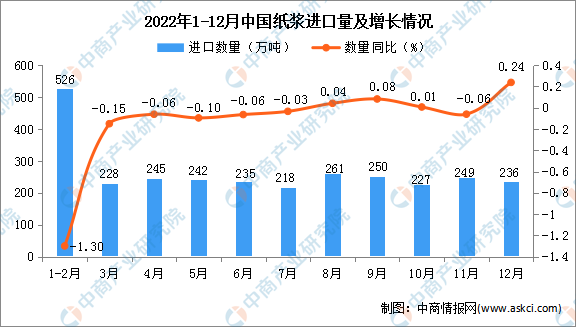 據(jù)中商產(chǎn)業(yè)研究院數(shù)據(jù)庫顯示,2022年12月中國紙漿進口量236萬噸,同比增長0.24%;1-12月我國紙漿累計進口量2916.3萬噸,同比下降1.8%。