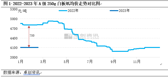 2023年1月份白板紙市場價格維持弱勢穩(wěn)定,市場交投活躍度不高。通過圖1可見,2023年1月A級250g灰底白板紙出廠含稅均價4106元/噸,與上月持平,較去年同期下滑14.70%。此波穩(wěn)定行情符合季節(jié)性特點,依然受需求影響所致。雖然規(guī)模紙廠天津基地于2月1日針對其低端產(chǎn)品提漲50元/噸,各基地計劃于2月20日提漲50元/噸,但僅個別紙廠積極跟漲,多數(shù)紙廠跟漲較為乏力,暫持穩(wěn)觀望。具體來看一下供需情況。