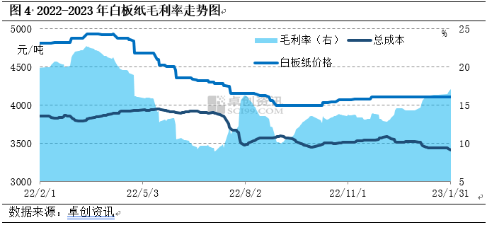 由圖4可見,2023年1月白板紙成本價格呈現(xiàn)下滑趨勢,對白板紙支撐減弱。其中廢黃板紙為白板紙主要上游原料,進入2023年以來,廢黃板紙價格卻持續(xù)刷新低點,其中再生纖維漿性價比凸顯和成品紙價格運行壓力是導致當前廢黃板紙價格探底的主要驅(qū)動因素。據(jù)卓創(chuàng)資訊數(shù)據(jù)監(jiān)測,1月份廢黃板紙市場價月均價為1785元/噸,較上月均價下跌8.08%,與2022年12月份相比跌幅擴大5.67個百分點,較去年同月均價下降24.20%。但白板紙市場均價持穩(wěn)運行,總成本價格下滑,因此行業(yè)毛利率增加,紙廠存小幅拉漲意向。