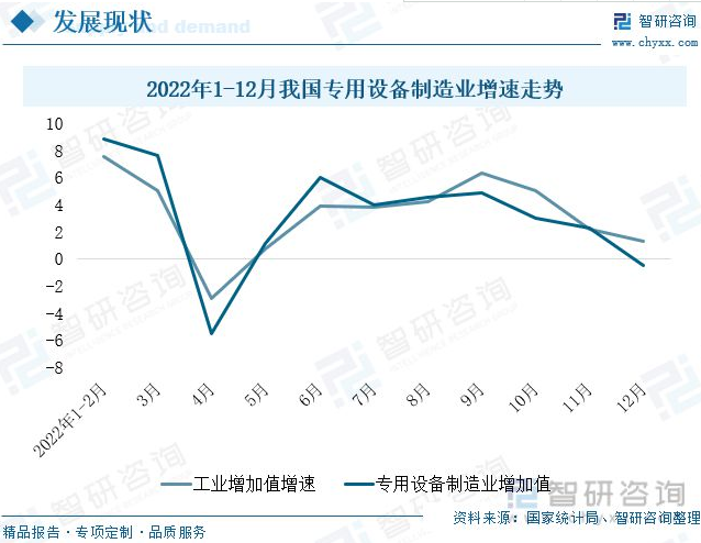 2022年以來(lái),在國(guó)際大宗商品價(jià)格高位運(yùn)行及疫情多地反復(fù)爆發(fā)影響下,國(guó)內(nèi)制造業(yè)受到一定沖擊,但在國(guó)家統(tǒng)籌調(diào)控下,我國(guó)制造業(yè)呈恢復(fù)向好態(tài)勢(shì)。2022年,全國(guó)規(guī)模以上工業(yè)生產(chǎn)保持穩(wěn)定恢復(fù)態(tài)勢(shì),增加值較上年增長(zhǎng)3.6%。造紙?jiān)O(shè)備是專(zhuān)用設(shè)備制造業(yè)的細(xì)分領(lǐng)域,2022年以來(lái),我國(guó)專(zhuān)用設(shè)備制造業(yè)增加值增速與工業(yè)增加值增速走勢(shì)基本保持一致。2022年1-4月,受多地疫情及俄烏沖突導(dǎo)致的能源價(jià)格上漲影響,專(zhuān)用設(shè)備生產(chǎn)企業(yè)經(jīng)營(yíng)受到較大沖擊,行業(yè)增加值增速降至-5.5%,位于臨界點(diǎn)以下。5-6月,隨著穩(wěn)經(jīng)濟(jì)一攬子政策措施,企業(yè)復(fù)工復(fù)產(chǎn)加快,專(zhuān)用設(shè)備制造業(yè)增加值增速迅速提升。7-9月,國(guó)家出臺(tái)了一系列推動(dòng)工業(yè)經(jīng)濟(jì)平穩(wěn)健康發(fā)展的措施,專(zhuān)用設(shè)備制造業(yè)增速保持穩(wěn)定增長(zhǎng)。10-12月,外部不確定性上升,制造業(yè)面臨較大壓力,專(zhuān)用設(shè)備制造業(yè)增速持續(xù)下滑;其中12月隨著防疫政策優(yōu)化調(diào)整,新冠感染量大幅增加,專(zhuān)用設(shè)備制造業(yè)增速下降至-0.5%,降至臨界點(diǎn)以下,行業(yè)生產(chǎn)有所回落。