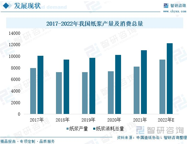 下游市場(chǎng)對(duì)造紙?jiān)O(shè)備行業(yè)發(fā)展具有重要促進(jìn)作用,下游產(chǎn)業(yè)不斷擴(kuò)張有利于本行業(yè)市場(chǎng)開(kāi)拓與產(chǎn)品研發(fā)。其中,紙漿是造紙工業(yè)中最重要的原材料,紙漿生產(chǎn)設(shè)備品類(lèi)較多,主要包括磨漿機(jī)、分切復(fù)卷機(jī)、干燥漿板機(jī)、壓縮機(jī)等多個(gè)造紙?jiān)O(shè)備。2017-2022年,我國(guó)紙漿產(chǎn)量及消費(fèi)量不斷增加。2021年我國(guó)紙漿產(chǎn)量及消費(fèi)總量分別增長(zhǎng)10.83%和7.94%。2022年隨著下游用紙需求不斷增加,紙漿產(chǎn)量及消費(fèi)量延續(xù)增速,同比增速約為15%和10.85%。未來(lái),隨著國(guó)內(nèi)制漿生產(chǎn)線(xiàn)規(guī)模不斷擴(kuò)大及對(duì)制漿質(zhì)量要求不斷提高,紙漿制造設(shè)備需求將進(jìn)一步上漲。