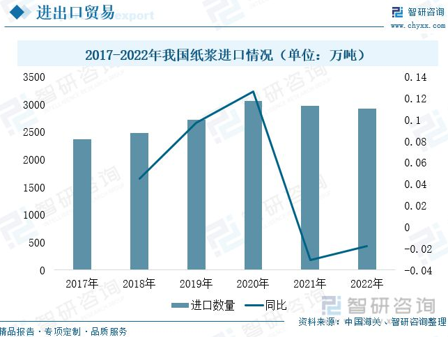 我國(guó)林木資源相對(duì)匱乏,森林覆蓋率遠(yuǎn)低于全球31%的平均水平,人均森林面積僅為世界人均水平的1/4。其中,能采伐的用材林年生長(zhǎng)不足1億立方米,導(dǎo)致我國(guó)紙漿進(jìn)口依存度較大。2021年我國(guó)紙漿進(jìn)口2969萬(wàn)噸,約占全國(guó)紙漿消費(fèi)量的27%。2021年中國(guó)生態(tài)環(huán)境部宣布全面禁止廢紙進(jìn)口后,我國(guó)紙漿進(jìn)口有所下滑,2022年進(jìn)口紙漿2916萬(wàn)噸,較2020年下降4.8%。在紙漿進(jìn)口量受限,需求量上漲的情況下,增加紙漿產(chǎn)線(xiàn)產(chǎn)能是造紙行業(yè)增加產(chǎn)量的重要方式,而新增紙漿產(chǎn)能將帶動(dòng)紙漿生產(chǎn)設(shè)備需求上漲。