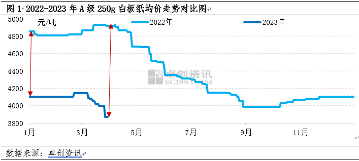 2023年一季度,白板紙市場呈現(xiàn)先穩(wěn)定后階梯式下滑走勢。白板紙市場一季度均價(jià)在4078.79元/噸左右,環(huán)比2022年四季度下滑0.01%,同比2022年一季度下滑15.88%。其中一季度高點(diǎn)出現(xiàn)在2月4143.75元/噸;低點(diǎn)在3月底3872.5元/噸。因一月正處于春節(jié)假期,紙廠停機(jī)檢修較多,調(diào)價(jià)意向不強(qiáng),市場弱穩(wěn)運(yùn)行。節(jié)后,因市場現(xiàn)貨供應(yīng)量不高,規(guī)模紙廠拉漲意向較強(qiáng),于2月下旬探漲50元/噸,但因市場需求恢復(fù)不及預(yù)期,3月開始紙廠連續(xù)下調(diào)共計(jì)3-4輪,累計(jì)幅度150-430元/噸,周邊多數(shù)紙廠跟跌,市場運(yùn)行乏力。