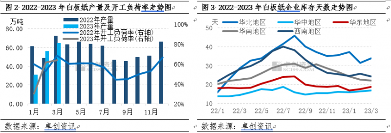 從供應(yīng)面來看,紙廠開工積極性減弱,但庫存壓力持續(xù)增加。由圖2可見2023年一季度白板紙紙廠整體開工水平雖呈現(xiàn)上漲趨勢,但同比去年一季度有所下滑,紙廠開工積極性減弱,個(gè)別小廠陸續(xù)退出。據(jù)卓創(chuàng)資訊數(shù)據(jù)顯示,一季度白板紙紙廠產(chǎn)量環(huán)比下滑9.38%,同比去年一季度下滑16.93%;開工負(fù)荷率環(huán)比下滑8.45個(gè)百分點(diǎn),較去年同期下滑4.44個(gè)百分點(diǎn)。