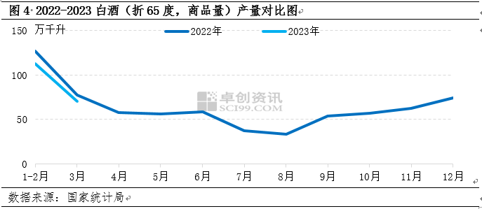 從需求面來看,一季度市場需求整體偏弱,其中白酒行業(yè)為白板紙下游重要消費(fèi)行業(yè),傳統(tǒng)白酒行業(yè)定義的旺季是從每年中秋節(jié)所在的一個(gè)月開始到次年3月結(jié)束。但今年來看,1-2月白酒產(chǎn)量下滑較為明顯。圖4可見,據(jù)國家統(tǒng)計(jì)局?jǐn)?shù)據(jù)顯示,2023年1-2月白酒產(chǎn)量112.4萬千升,同比下滑11.22%。因終端需求恢復(fù)不及預(yù)期,經(jīng)銷商及印廠整體訂單不足,下游接盤意向較低,因此一季度市場提前進(jìn)入淡季。