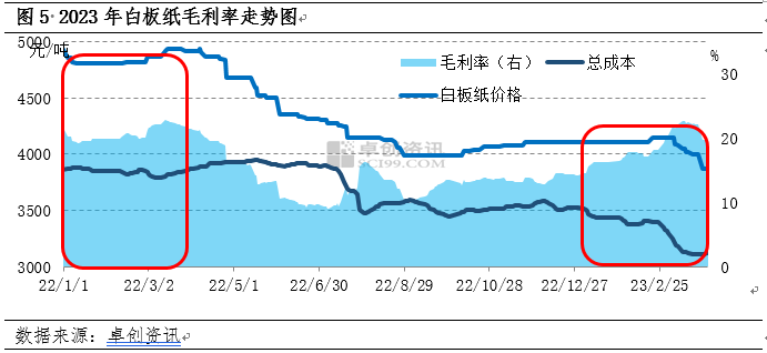 由圖5可見,2023年一季度白板紙毛利率呈現(xiàn)倒V字型走勢。其中,廢黃板紙作為主要的原料之一,廢紙市場價(jià)格的延續(xù)2022年下半年跌勢,價(jià)格一路下行,對白板紙市場支撐無力。2023年1-3月份,國內(nèi)廢黃板紙價(jià)格影響因素則轉(zhuǎn)向了需求端。隨著國內(nèi)限制措施全面放開,廢黃板紙供應(yīng)恢復(fù)正常。但需求壓力開始顯現(xiàn),由于成品紙需求不及預(yù)期,紙企為了修復(fù)利潤,率先下調(diào)廢黃板紙價(jià)格。2023年2月中旬以后,紙企為降低成品紙庫存也開啟了成品紙價(jià)格下調(diào)的格局。由圖5可見,一季度總成本環(huán)比去年四季度下滑5.81%,較2022年一季度下滑13.63%,但因白板紙價(jià)格走勢先穩(wěn)定后下行,因此毛利率呈現(xiàn)先上漲后下滑趨勢。據(jù)卓創(chuàng)資訊數(shù)據(jù)顯示,一季度白板紙毛利率環(huán)比上漲5.04個(gè)百分點(diǎn),但同比去年同期下降2.10個(gè)百分點(diǎn)。因此從行業(yè)毛利率來看,紙廠開工積極性較去年有所減弱,市場運(yùn)行動(dòng)力不足。
