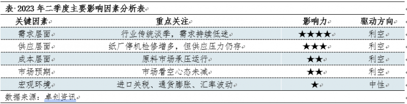 從需求端來看,二季度通常為行業(yè)傳統(tǒng)淡季,市場需求持續(xù)低迷,經(jīng)銷商仍無備貨意向,市場成交剛需為主,將利空紙價(jià);從供應(yīng)端來看,紙廠開工積極性減弱,停機(jī)檢修增多,據(jù)目前企業(yè)公布停機(jī)檢修計(jì)劃來看,預(yù)計(jì)二季度檢修損失量約13萬噸左右,但山東地區(qū)有一條35萬噸新增產(chǎn)能或?qū)⒂?月釋放,因此市場供應(yīng)壓力仍存。因此綜合供需來看,供需矛盾改善空間不大,市場運(yùn)行乏力。