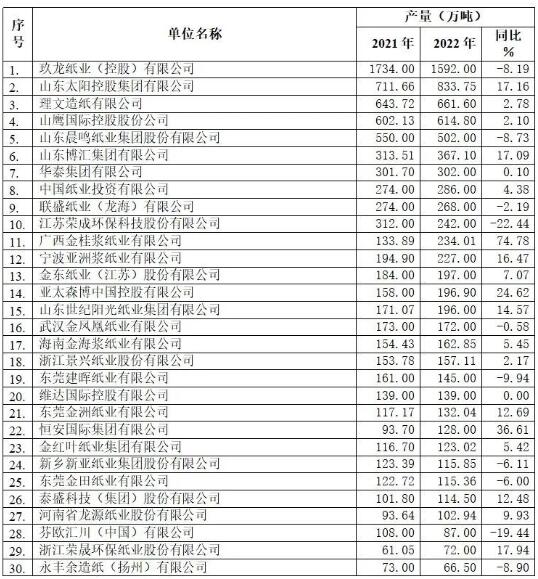 (2022年重點(diǎn)造紙企業(yè)產(chǎn)量前30名企業(yè))