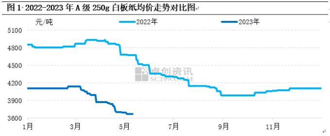 五一節前規模紙廠陸續發布五一假期優惠50元/噸,但因5月仍處于傳統淡季,市場運行乏力,多數紙廠延續前期優惠,個別中小廠下調30-50元/噸。據卓創資訊數據顯示,截至2023年5月15日,A級250g灰底白板紙出廠含稅日均價3668.75元/噸,較去年同期下滑21.52%。