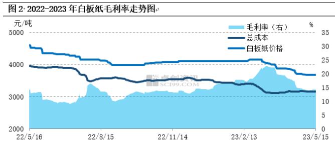 5月以來,白板紙毛利率震蕩下滑,據卓創資訊監測數據顯示,截至5月15日,白板紙平均毛利率較4月上半旬下滑4.50個百分點。作為白板紙主要上游原料的廢舊黃板紙,5月份價格穩中上移,主要因局部降雨較多,因此廢紙市場供應偏緊影響價格上漲。在行業毛利率下滑的影響下,紙廠開工積極性減弱,4月底規模紙廠東莞基地再次發布5月停機檢修通知,共計7天左右。部分紙廠為緩解庫存壓力,亦存停機檢修情況或降低車速。