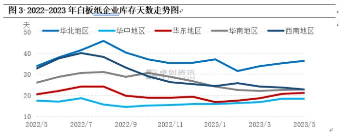 5月仍處于行業傳統淡季,終端需求始終欠佳,下游接盤意向較低。受客戶買漲不買跌的心理,經銷商備貨心態仍顯謹慎,市場成交剛需為主。因此,紙廠出貨較為緩慢,雖有停機檢修情況,但庫存壓力仍存。據卓創資訊顯示,截至5月15日,白板紙生產企業庫存量較去年同期上漲1.79%左右,庫存天數22天左右,整體庫存水平處于高位。