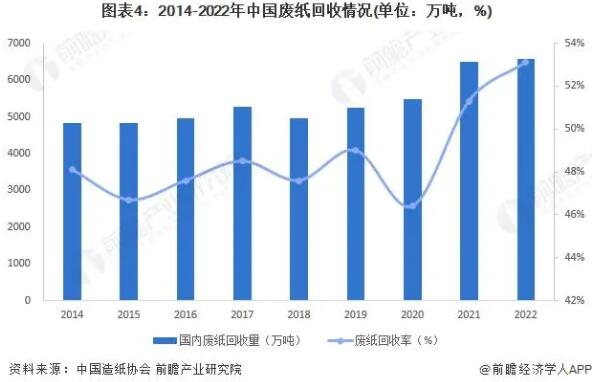 2014-2022年 ,中國廢紙回收量及回收率均呈波動上升趨勢。2014年,中國廢紙回收量為4841萬噸,回收率為48.1%;到2022年,我國廢紙回收量達到6600萬噸左右,回收率增至53%以上。