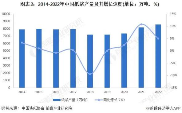 根據中國造紙協會的統計數據,2014-2022年,我國紙漿產量呈現波動變化趨勢。由于數字化和無紙化的推進,紙漿下游市場出現較多的替代品,紙漿需求有所下降。2017-2020年紙漿的產量整體上處于下降態勢。2021-2022年,我國紙漿產量有所回升,2022年產量為8587萬噸,同比增長5%。