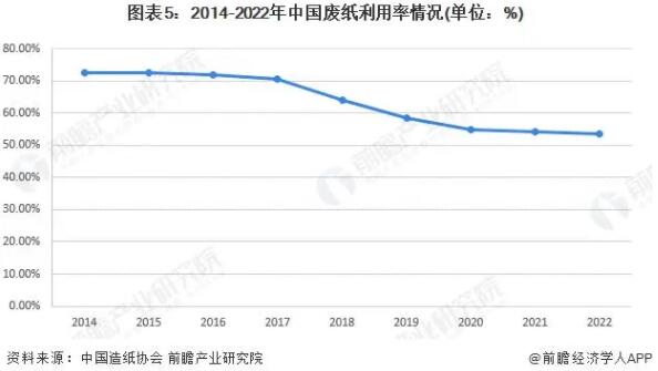 近年來,我國廢紙回收量不斷增長,相比較而言,廢紙消費量小于回收量,這導致我國廢紙利用率下滑明顯。2014-2017年,我國廢紙利用率均高于70%,到2022年,我國廢紙利用率已跌至53.5%。