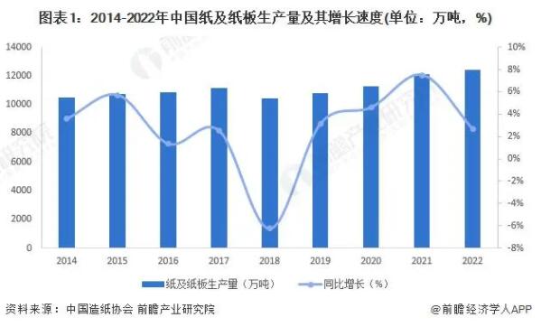 根據中國造紙協會的統計數據,2014年以來,我國紙及紙板產量整體呈現震蕩上行趨勢,增速保持在低位運行。2017年我國紙及紙板生產量首次突破11000萬噸;2018年,受行業景氣度下滑影響,整體產量小幅下滑,2019-2022年,產量逐年遞增,至2022年中國紙及紙板生產量達到12425萬噸,同比增長2.6%。