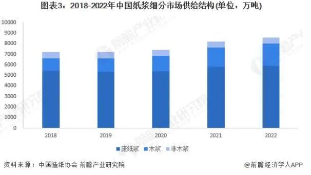 從中國紙漿細分市場供給結構來看,2018-2022年,廢紙漿供給量均位列第一,占總產量比例呈逐年下降趨勢,從76%下降至69%。2022年,廢紙漿供給量達到5914萬噸,較上年增加100萬噸。