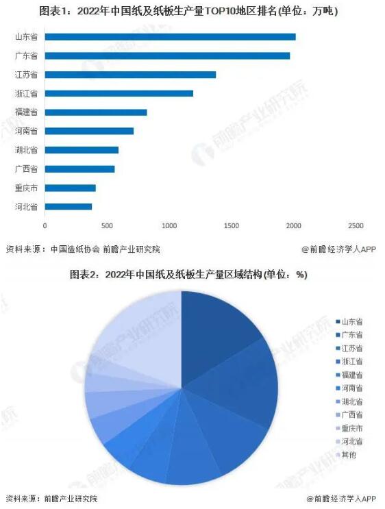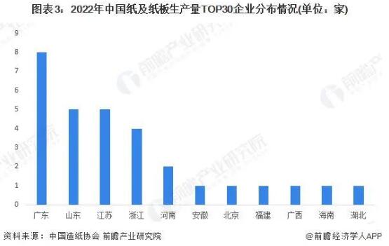 根據中國造紙協會公布的 2022 年紙及紙板產量 TOP30 企業的分布情況,有 8 家企業位于廣東省,包括排名第一的玖龍紙業和排名第三的理文造紙; 有 5 家企業位于山東省,其中太陽控股、晨鳴紙業、博匯集團、華泰集團四家企業位列前十。