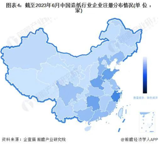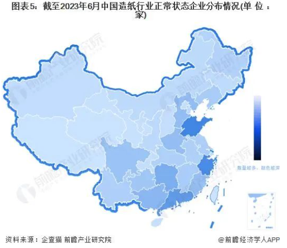 從注冊企業分布來看,根據企查貓披露的數據顯示,截止 2023 年 6 月 12 日,我國造紙行業注冊企業數量為 6411 家,其中,浙江省、山東省、河南省的注冊企業數量最多,分別有 815 家、591 家、562 家。