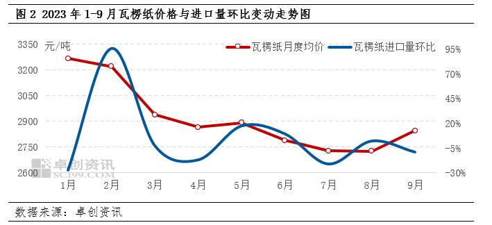 2023年以來,進口瓦楞紙量價變化對國內供需形勢形成持續影響。1-9月瓦楞紙進口量同比增長45.35%,多元化調節補充國內瓦楞紙現貨市場的同時,也成為影響我國瓦楞紙市場走勢的一個重要因素。