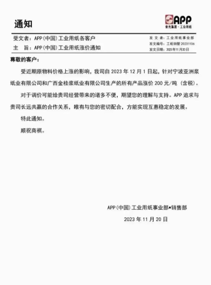 APP(中國(guó))工業(yè)用紙事業(yè)部:受近期原物料價(jià)格上漲的影響,我司自2023年12月1日起針對(duì)寧波亞洲漿紙業(yè)有限公司和廣西金桂漿紙業(yè)有限公司生產(chǎn)的所有產(chǎn)品漲價(jià)200元/噸(含稅)
