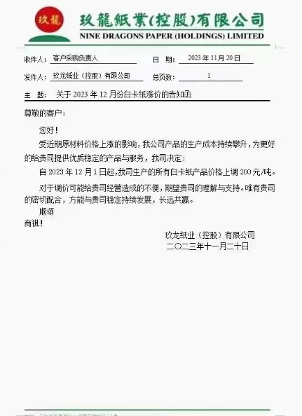玖龍紙業(yè):自2023年12月1日起我司生產(chǎn)的所有白卡紙產(chǎn)品價(jià)格上調(diào)200元/噸