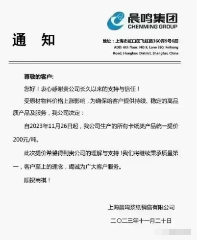 上海晨鳴漿紙銷售有限公司:自2023年11月26日起,我公司生產(chǎn)的所有卡紙類產(chǎn)品統(tǒng)一提價(jià)200元/噸