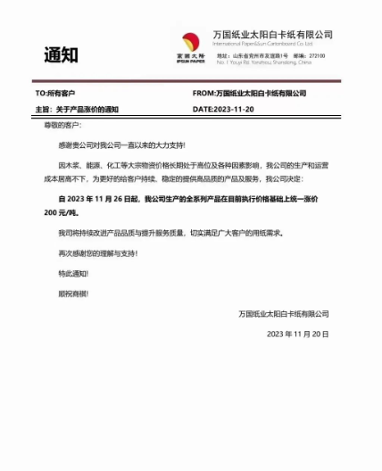 萬國(guó)紙業(yè)太陽(yáng)白卡紙有限公司:自2023年11月26日起,我公司生產(chǎn)的全系列產(chǎn)品在目前執(zhí)行價(jià)格基礎(chǔ)上統(tǒng)一漲價(jià)200元/噸