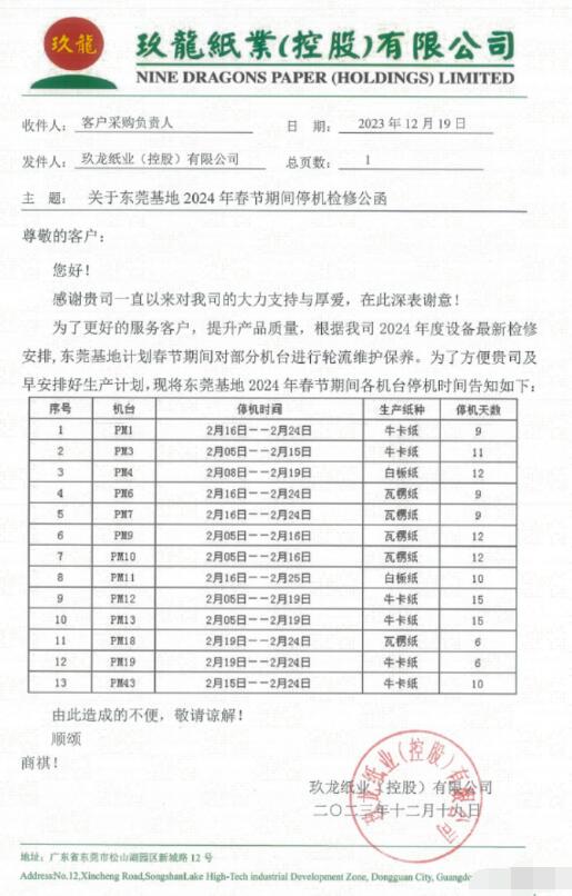 繼發布北方三基地的停機安排后,玖龍紙業在12月19日宣布了廣東東莞和江蘇太倉基地的春節檢修計劃,按照設計產能計算,兩大基地的20臺包裝紙機將在2024年1-2月合計減產約26.5萬噸。
