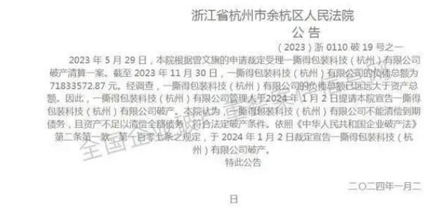 杭州市余杭區(qū)人民法院日前發(fā)公告稱,一撕得包裝科技(杭州)有限公司(下稱“一撕得公司”)不能清償?shù)狡趥鶆眨屹Y產(chǎn)不足以清償全部債務,故裁定其破產(chǎn)。