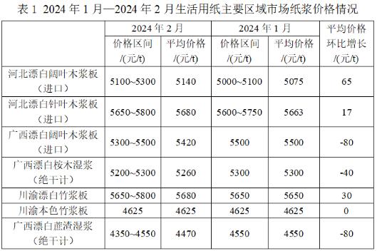 據(jù)《生活用紙》雜志調(diào)研數(shù)據(jù),2024年2月各類紙漿原料平均價(jià)格相較2024年1月,雖然有所波動(dòng),但變化幅度較小,總體價(jià)格相對(duì)穩(wěn)定。2月上旬和中旬,紙漿價(jià)格整體處于穩(wěn)定狀態(tài),春節(jié)返工后,河北地區(qū)進(jìn)口木漿平均價(jià)格有所上漲,廣西地區(qū)各類紙漿平均價(jià)格有所下降。
