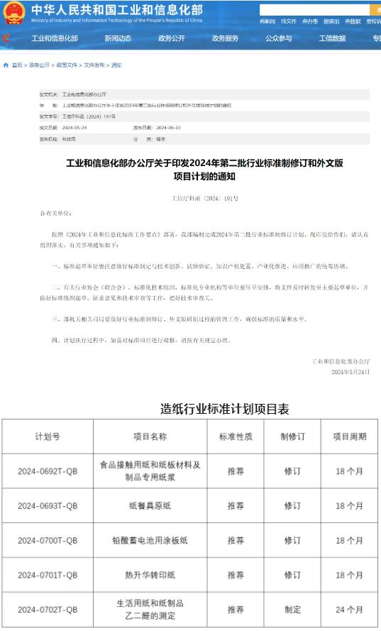 近日,國家工業和信息化部辦公廳下達2024年第二批行業標準制修訂和外文版項目計劃的通知(工信廳科函[2024]191號)。其中,《熱升華轉印紙》等5項造紙行業標準計劃項目獲批立項,具體如下所示。