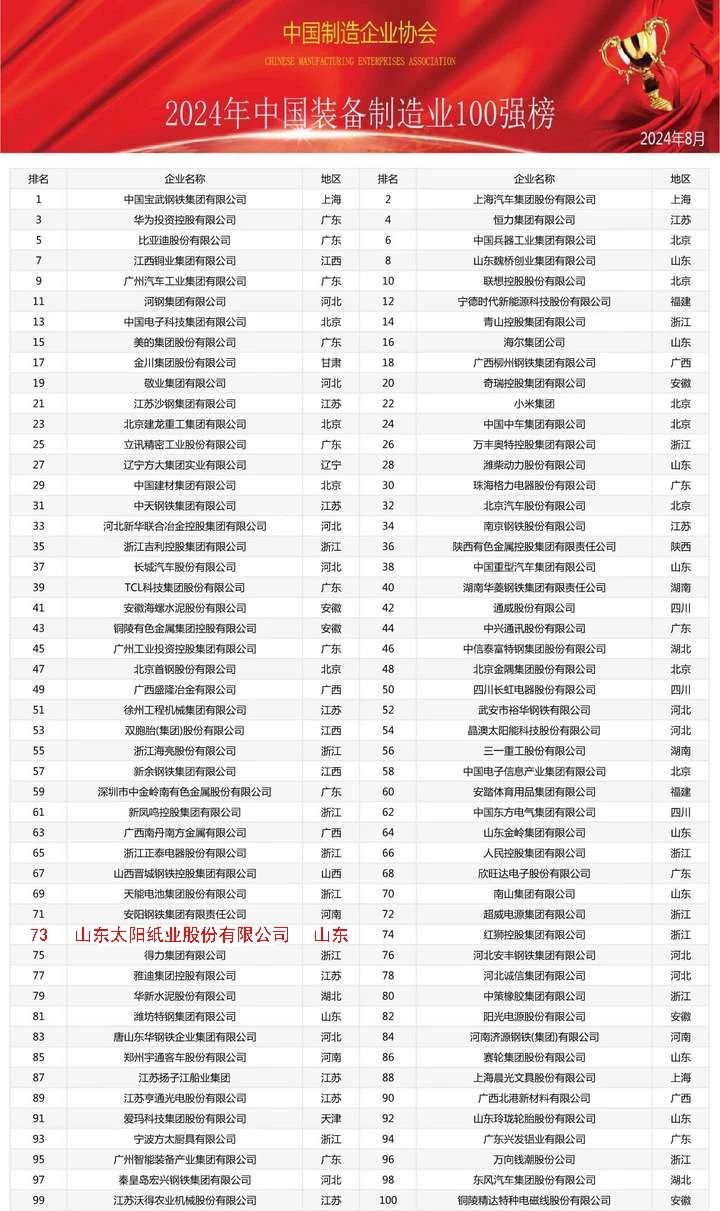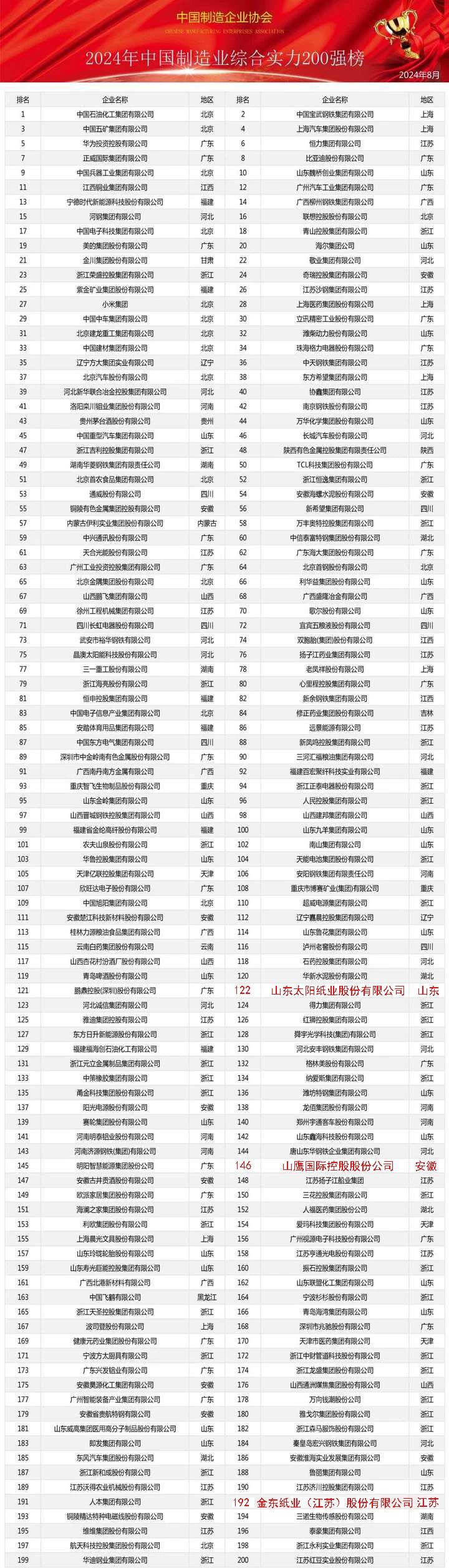 近日,中國制造企業協會對外發布《2024中國制造業綜合實力200強暨中國裝備制造業百強》榜單。其中,太陽紙業、山鷹國際、金東紙業憑借出眾的創新能力和出色的業績表現,再次入圍2024中國制造業綜合實力200強榜單,分別位列第122位、146位、192位;同時,太陽紙業入圍2024中國裝備制造業百強榜單,位列第73位。