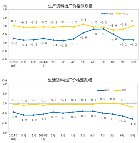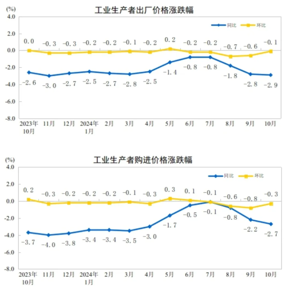 11月9日,國家統計局發布了2024年10月份工業生產者出廠價格情況。2024年10月份,全國工業生產者出廠價格同比下降2.9%,工業生產者購進價格同比下降2.7%。工業生產者出廠價格環比下降0.1%,工業生產者購進價格環比下降0.3%,降幅均比上月收窄0.5個百分點。1—10月平均,工業生產者出廠價格和購進價格均比上年同期下降2.1%。