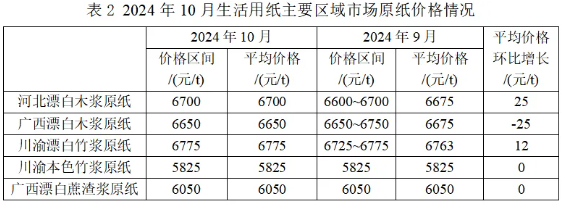 2024年10月,不同區域生活用紙市場原紙價格保持穩定。僅河北地區漂白木漿原紙、廣西漂白木漿原紙、川渝漂白竹漿原紙平均價格小幅度波動,川渝本色竹漿原紙和廣西漂白蔗渣漿原紙平均價格不變。
