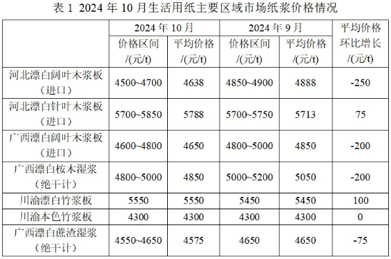 據《生活用紙》雜志調研數據,2024年10月生活用紙主要區域市場,川渝地區本色竹漿板平均價格相對穩定,河北進口漂白針葉木漿板和川渝地區漂白竹漿板平均價格有所上漲。其他各類紙漿平均價格下降,其中,河北進口漂白闊葉木漿板平均價格降幅最大,達到250元/t。
