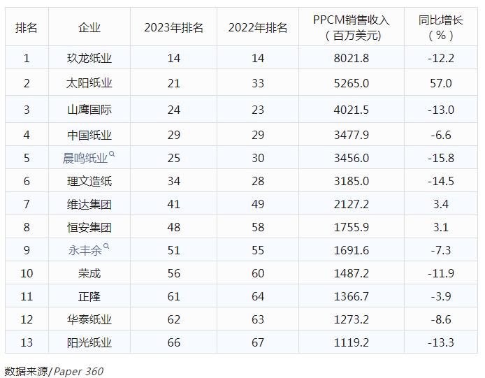 最新一期出版的美國paper360雜志根據2023年(部分企業為財年)企業紙漿、紙張、加工和貿易 (PPCM) 業務的凈銷售額為依據,公布了最新的全球紙業75強名單。