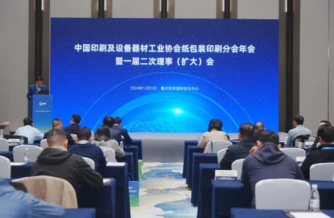 2024年12月3日,中國印刷及設備器材工業協會紙包裝印刷分會年會暨一屆二次理事(擴大)會在重慶召開。中國印工協副理事長楊民強,中國印工協紙包裝印刷分會輪值理事長、廈門吉宏科技股份有限公司副董事長張和平,中國印工協紙包裝印刷分會輪值理事長、濟南泉華包裝制品有限公司董事長邢憲卿,紙包裝印刷分會的常務理事單位、理事單位以及會員企業近120人參加了會議。會議對過去一年紙包裝印刷行業進行了分析,對紙包裝印刷分會的工作成果進行了梳理,并為紙包裝印刷分會理事長、常務理事和理事單位授牌。